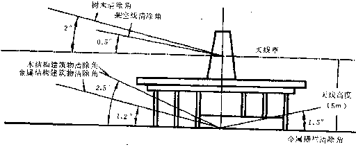 5.7.1 以天線為中心,半徑200 m以內不得有建筑物(機房除外);半徑200 m以外,金屬結構建筑物的高度不應超過以天線基礎為準1.2o垂直張角,木質結構建筑物的高度不應超過以天線基礎為準2.5o垂直張角。